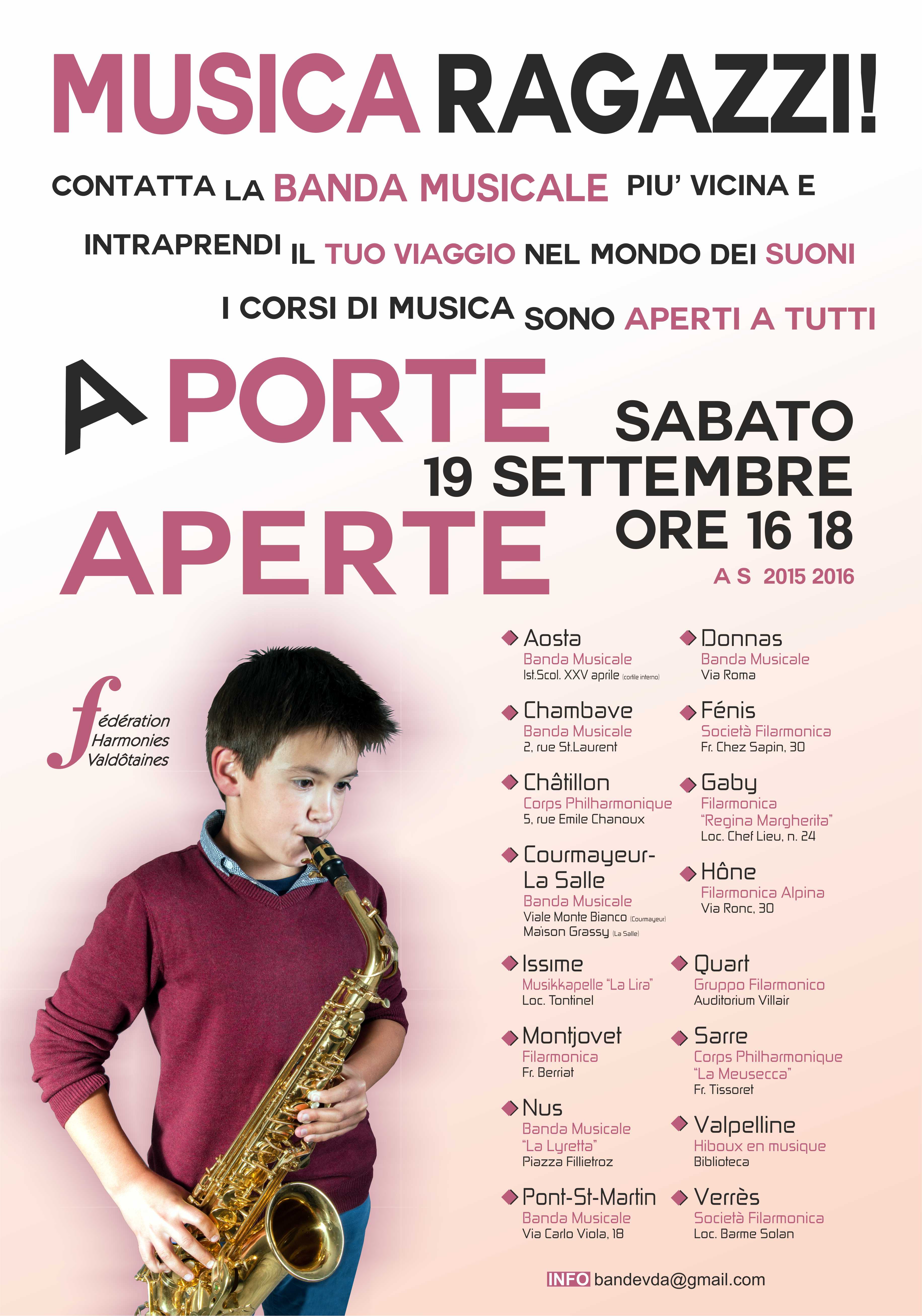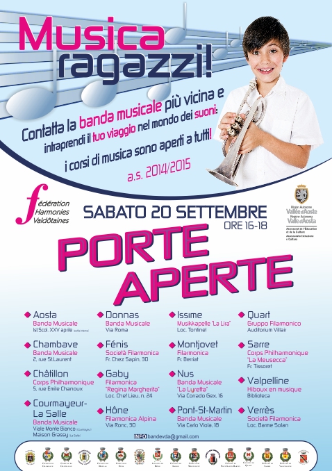 Tutte le bande musicali aderenti alla Fédération des Harmonies Valdôtaines gestiscono una scuola di musica per la formazione di nuove leve. Nelle scuole di musica è possibile apprendere i primi rudimenti musicali attraverso il canto, il ritmo, il gesto e il movimento, imparare a leggere la musica, a suonare gli strumenti a fiato (oboe, fagotto, flauto, clarinetto, saxofono, tromba, corno, trombone, euphonium, tuba) o a percussione e soprattutto scoprire il piacere dell’esperienza del fare musica insieme che è il segreto della ragguardevole longevità delle formazioni bandistiche.